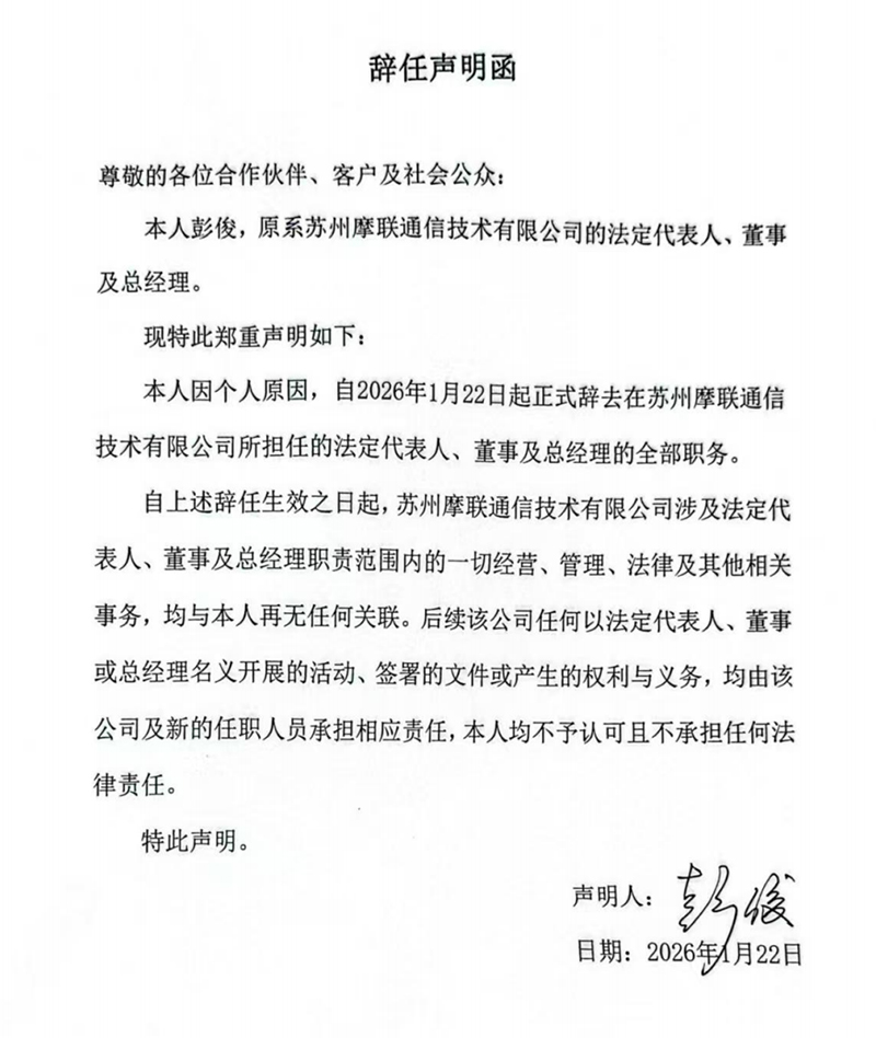 Suzhou MoreLink Communication Technology Co., Ltd. hereby announces that the former Legal Representative, Director, and General Manager of the Company has formally resigned from all positions held within the Company due to personal reasons, effective January 22, 2026.